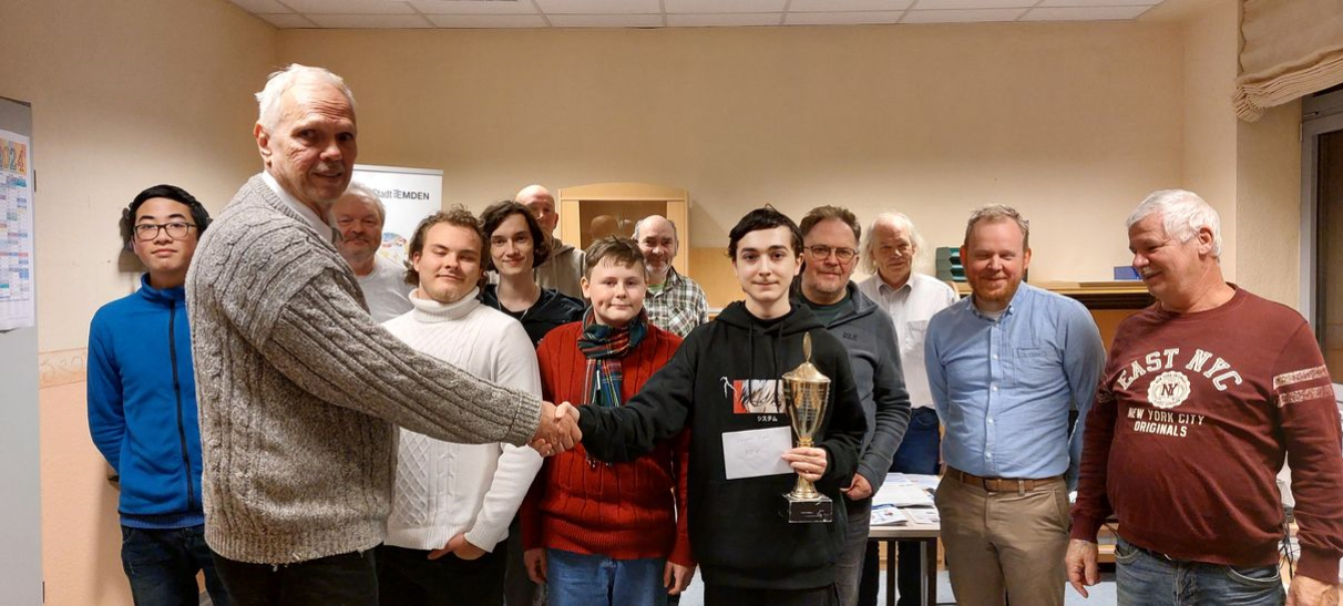 Der 15-jährige Giorgi Giorgadze wurde am Donnerstag zum neuen Stadtmeister von Emden gekürt. Er gewann alle sieben Partien des offenen Turniers, das mit 17 Teilnehmern aus der Region gut besetzt war. Zweiter wurde Eilert Janssen, dritter Marlon Wiltfang, der auch den Jugendpreis erhielt. Das Turnier zog viele neue Gesichter an, was die aktuelle Beliebtheit des Spiels zeigt. Das nächste Schachereignis ist das Weihnachtsblitzturnier am 30. Dezember im Kulturbunker.