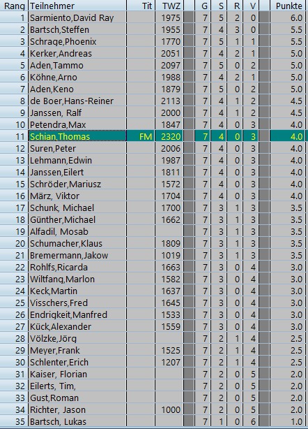 Sieger des harmonischen Turniers wurde David Ray Sarmiento aus Lingen mit 6 aus 7 Punkten, Er spielte nur zweimal Remis gegen Bartsch und Kerker und gewann 5 Partien. Auf den folgenden Plätzen landeten: 2. Steffen Bartsch, 3. Phonix Schrage, 4. Andreas Kerker, 5. Tammo Aden
