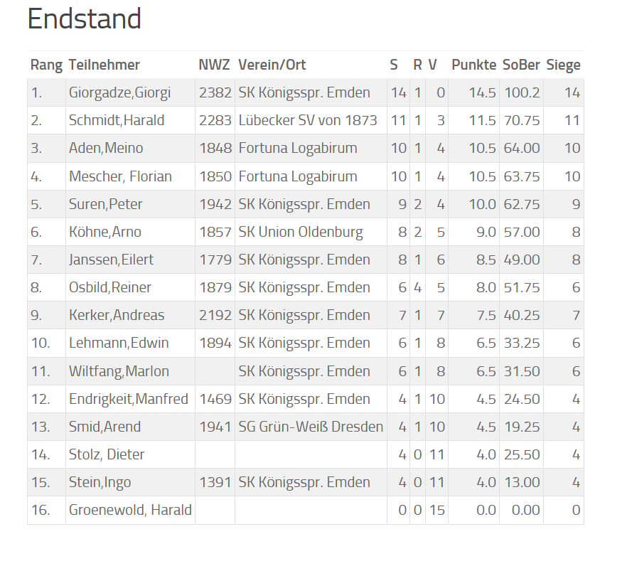 Sieger wurde der derzeit in den Top 25 Niedersachsens angesiedelte Spieler Giorgi Giorgadze, gefolgt vom 55-jährigen Harald Schmidt. Schmidt, der aus dem Emder Nachwuchs hervorgegangen ist, spielte lange für Lübeck in der zweiten Bundesliga und errang dort den Titel eines Fide-Meisters.